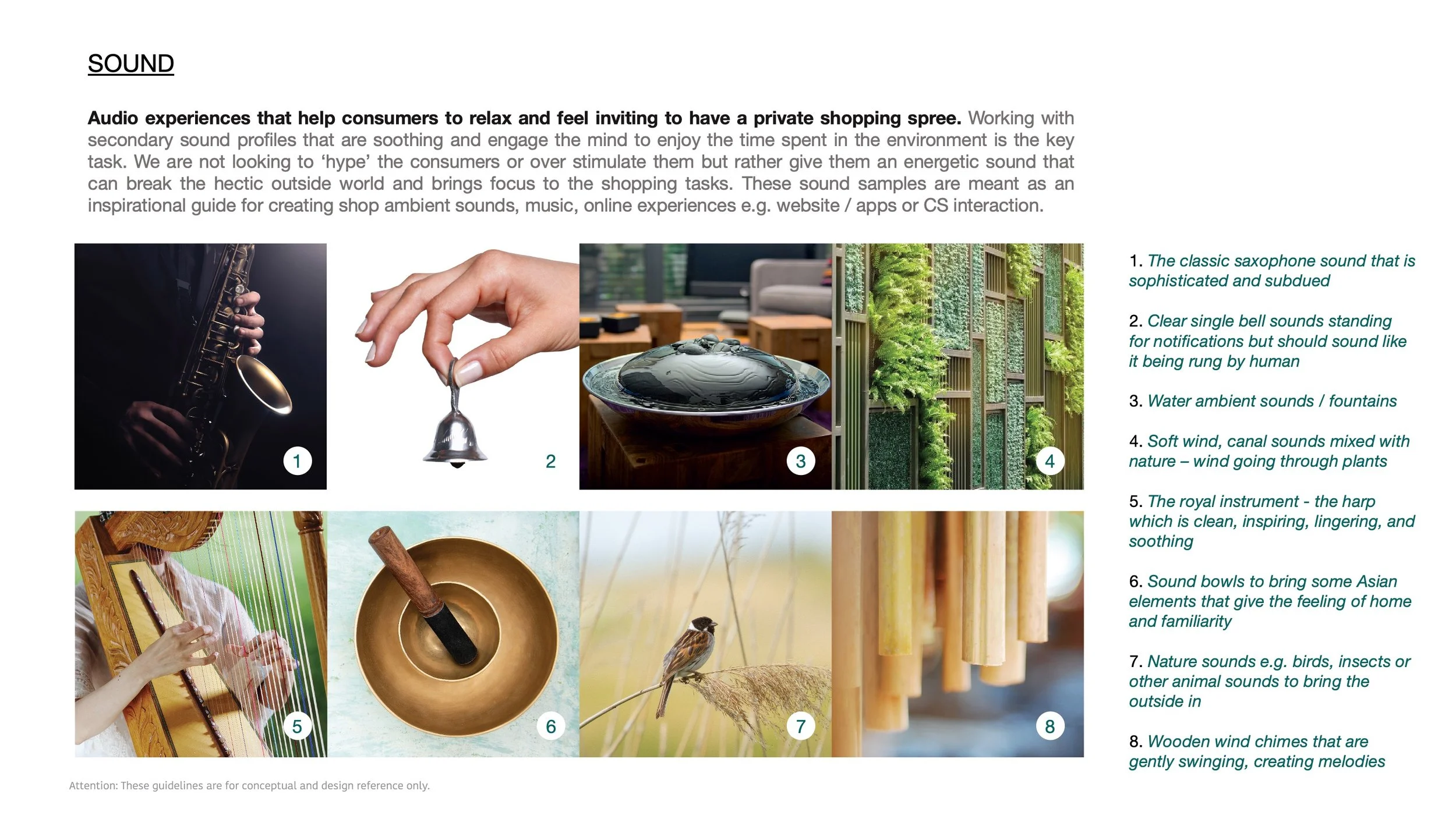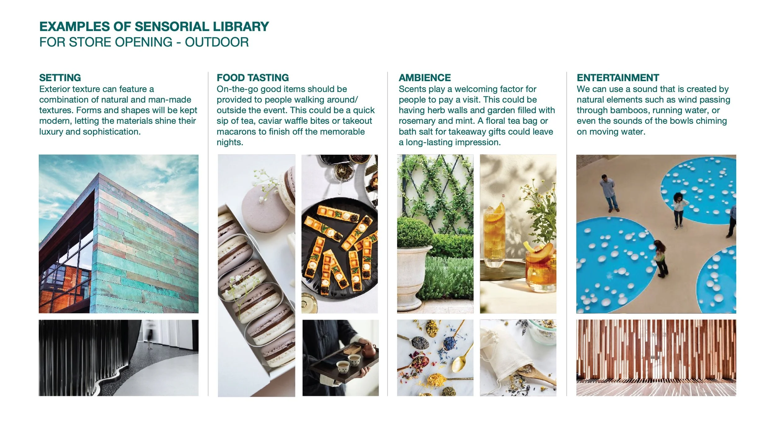 Each sensory segment has versatile applications — informing everything from interior and exterior design, event atmospheres, and product design, to soundscapes, lighting, and multi-sensory brand activations.